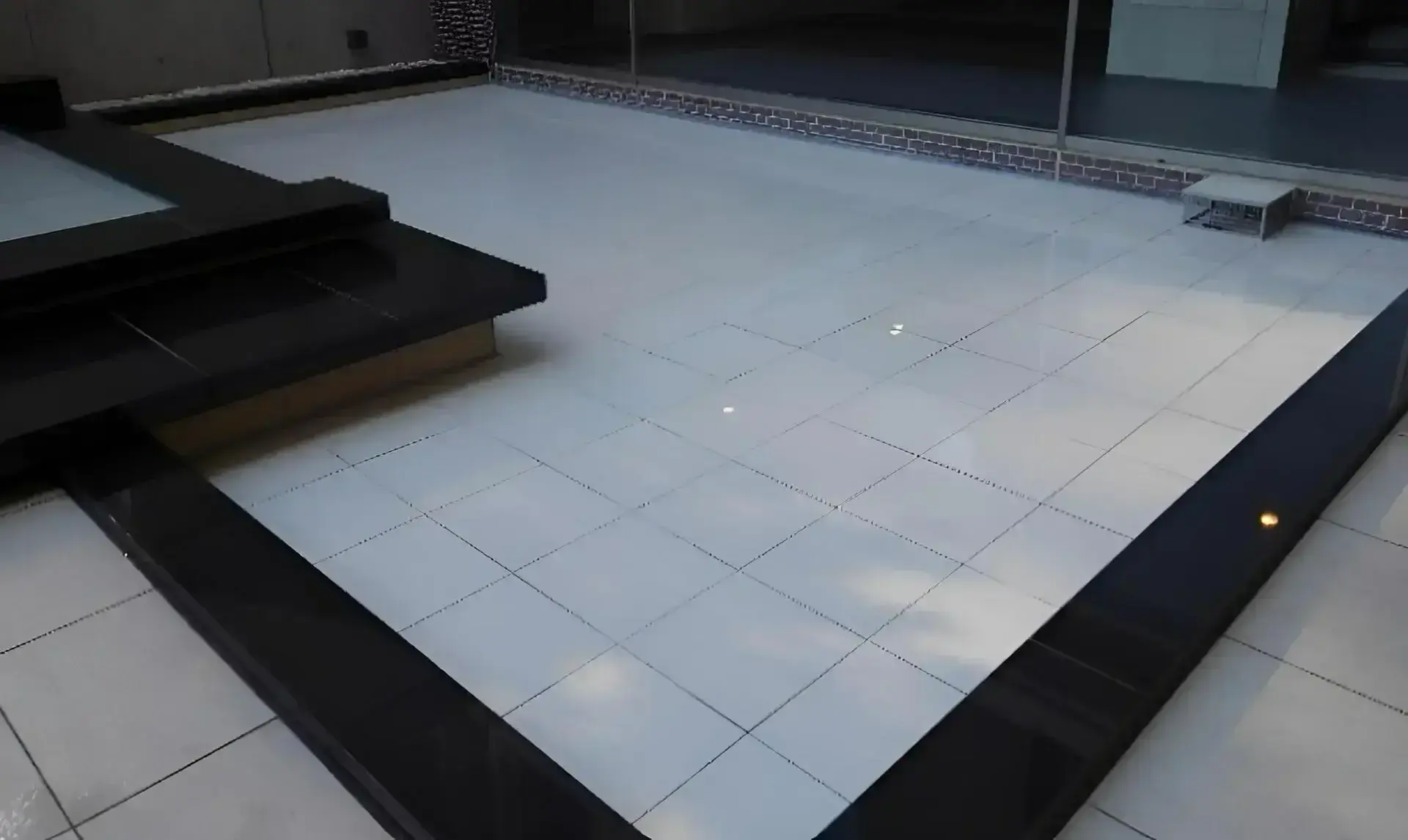 付着強度が高く、3N/miの引張にも耐える為、タイル・石貼り工事の際にロデムレギュラーを使用することにより、防水工事、タイル・石貼り工事の2工程を同時にすることができ、大幅な工期、コストダウンを実現すること
