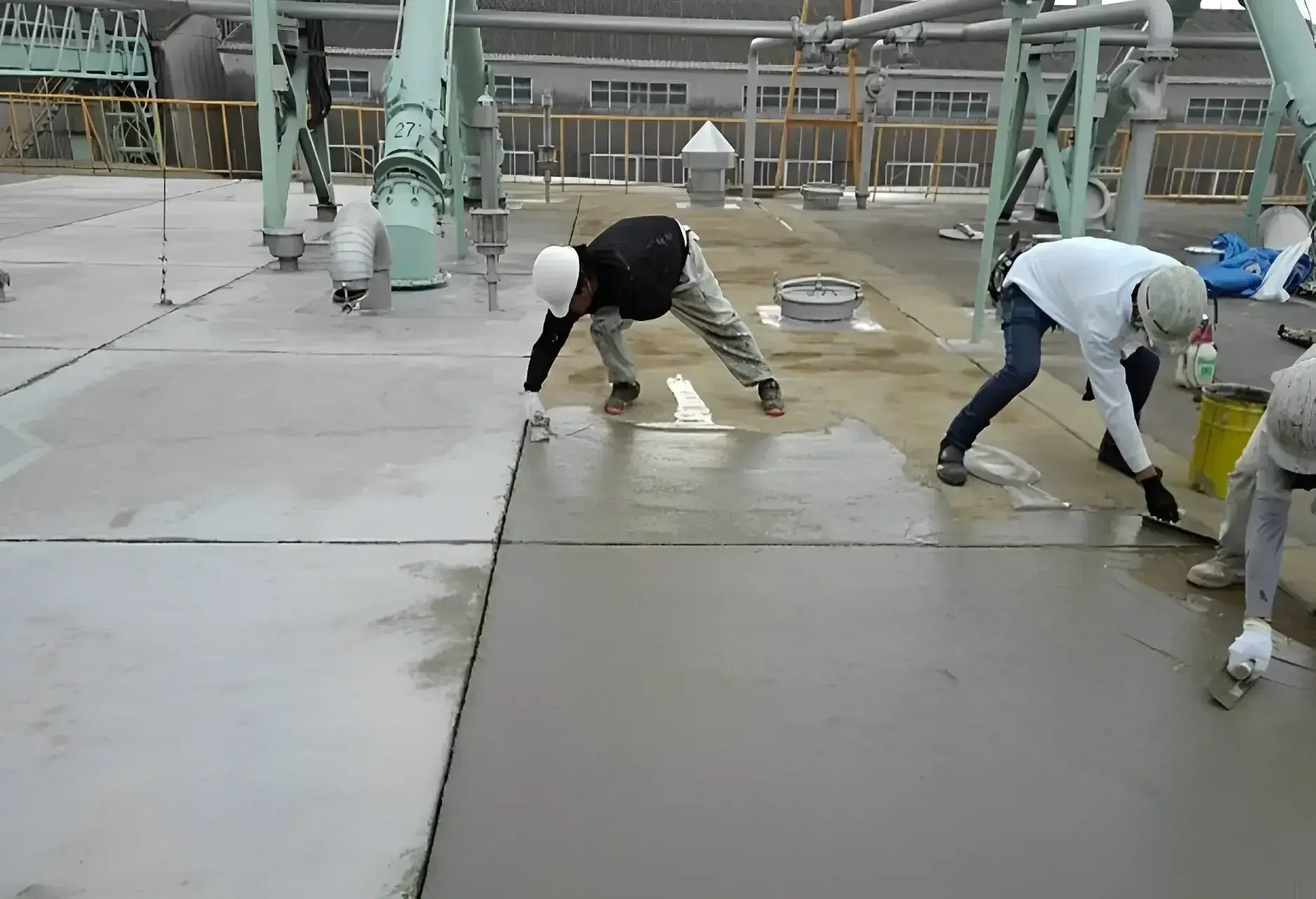 新設時のスラブ打設では、打設後にロデムレギュラー又はロデムファイバーを金コテ仕上げで施工完了。 既存コンクリートの場合は、洗浄後下塗り材を必要とせず、湿潤した状態で1mmを目安に1回塗りで防水は完了します。